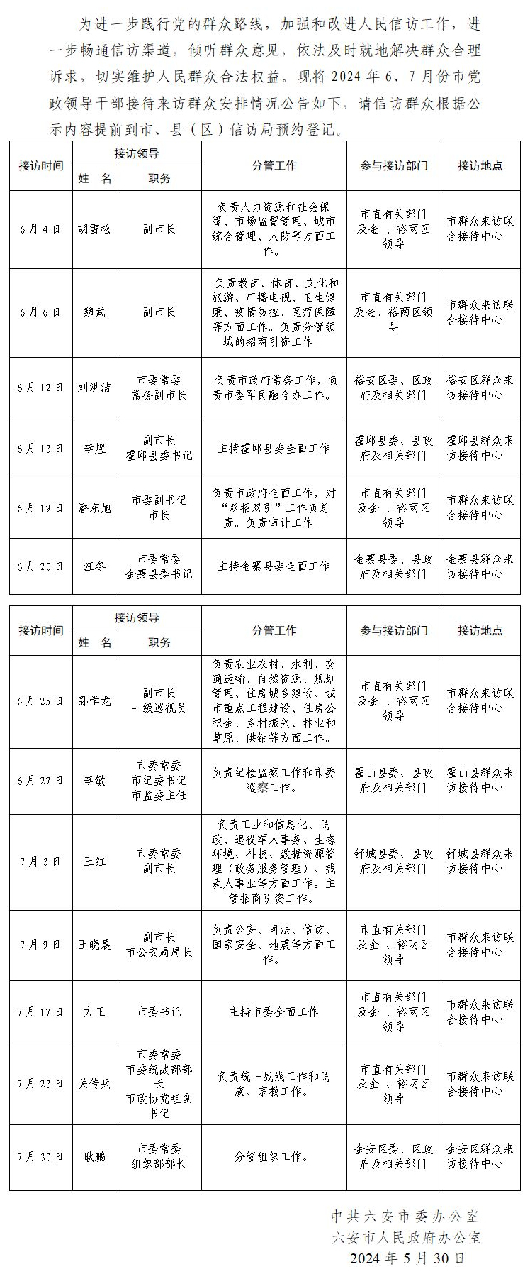 2024年6、7月份市党政领导干部接待来访群众安排情况公告