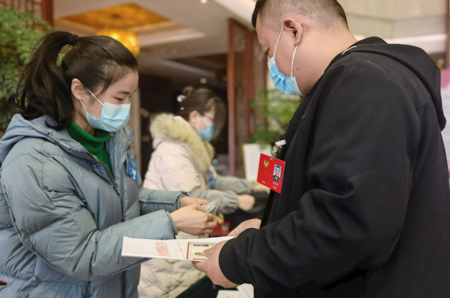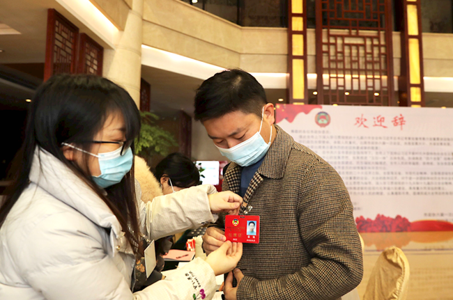 2月7日上午,在政协第六届一次会议的报到现场,工作人员为参会委员佩戴出席证。