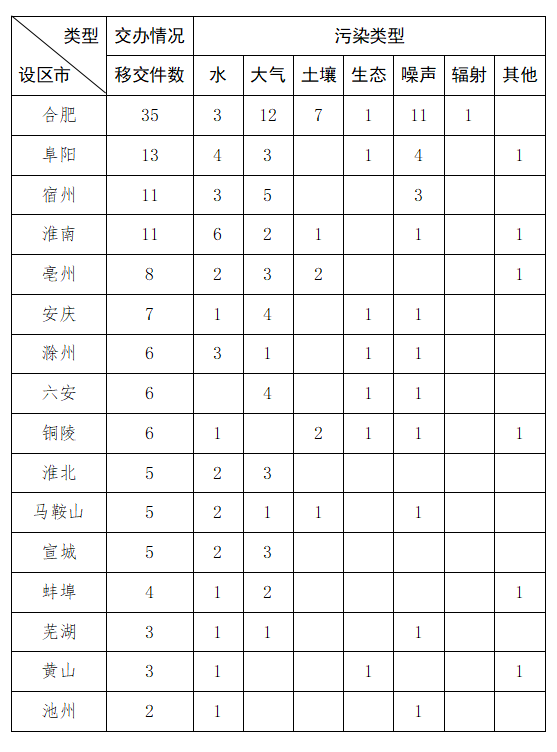 截至11月13日9时,我省收到中央第二生态环境保护督察组转办的第二十四批群众信访举报件130件,涉及环境问题130个。其中,大气环境问题44个、水环境问题33个、噪声问题26个、土壤问题13个、生态问题7个、其他污染问题6个、辐射问题1个。第二十四批转办信访件涉及16个地市,分别是:合肥市(35件)、阜阳市(13件)、宿州市(11件)、淮南市(11件)、亳州市(8件)、安庆市(7件)、六安市(6件)、滁州市(6件)、铜陵市(6件)、宣城市(5件)、马鞍山市(5件)、淮北市(5件)、蚌埠市(4件)、黄山市(3件)、芜湖市(3件)、池州市(2件)。