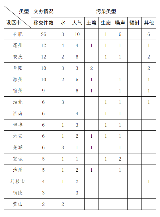 截至11月18日9时,我省收到中央第二生态环境保护督察组转办的第二十九批群众信访举报件128件,涉及环境问题128个。其中,大气环境问题52个、水环境问题27个、噪声问题18个、其他污染问题15个、土壤问题8个、生态问题8个。第二十九批转办信访件涉及16个地市,分别是:合肥市(26件)、亳州市(12件)、安庆市(12件)、阜阳市(10件)、滁州市(10件)、宿州市(9件)、淮北市(6件)、淮南市(6件)、蚌埠市(6件)、六安市(6件)、芜湖市(6件)、宣城市(5件)、池州市(5件)、马鞍山市(4件)、铜陵市(3件)、黄山市(2件)。
